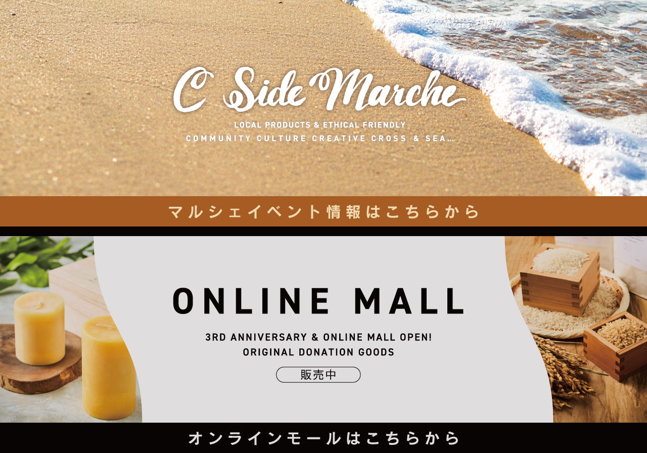 2026年1月のC Side Marche開催のお知らせ 日時:2026年1月24日(土) 25日(日)10:00~16:00会場:テラスモール湘南 ゲートスクエア出店:約90店/1日(予定) 「C Side Marche」は、LocalProducts&EthicalFriendlyをテーマにした環境については皆様と考えていくイベントです。 ご来場の際には、ペットボトルのお持ち込みはご遠慮頂き、マイバックのご持参とゴミのお持ち帰りにご協力ください。 出店者、事務局一同、皆様のご来場を楽しみにお待ちしております。 主催:C Side Marche実行委員会協賛:テラスモール湘南後援:藤沢市実行:株式会社小田急エージェンシー 【電車でお越しの場合】 JR「辻堂駅」北口より直結 ※土日祝日は、周辺道路・駐車場が混雑しますので、電車・バス等公共交通機関のご利用をお願いいたします。 ※駐車場の入場規制を行う場合もございますので、その際は係員の案内に従って頂きますようお願いいたします。