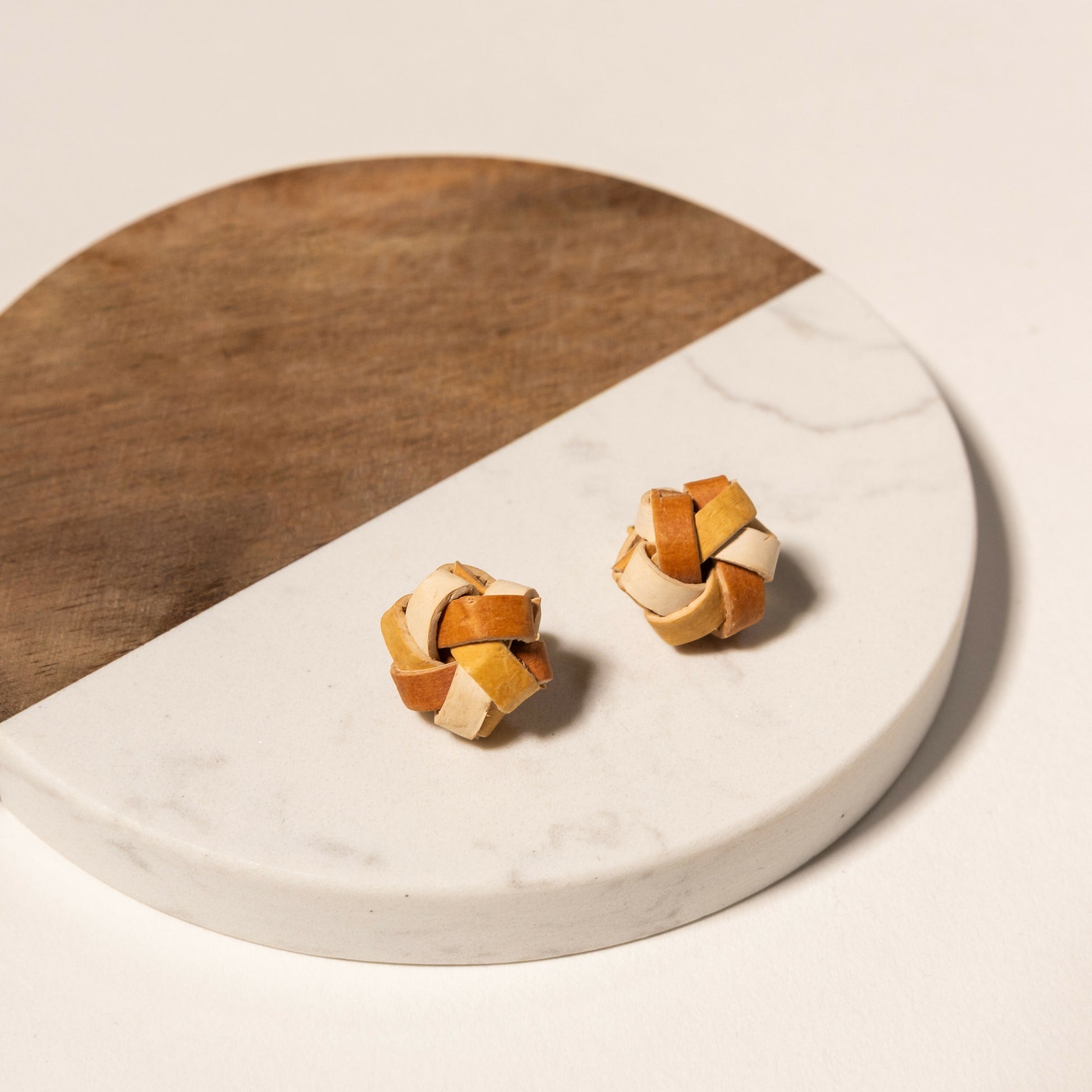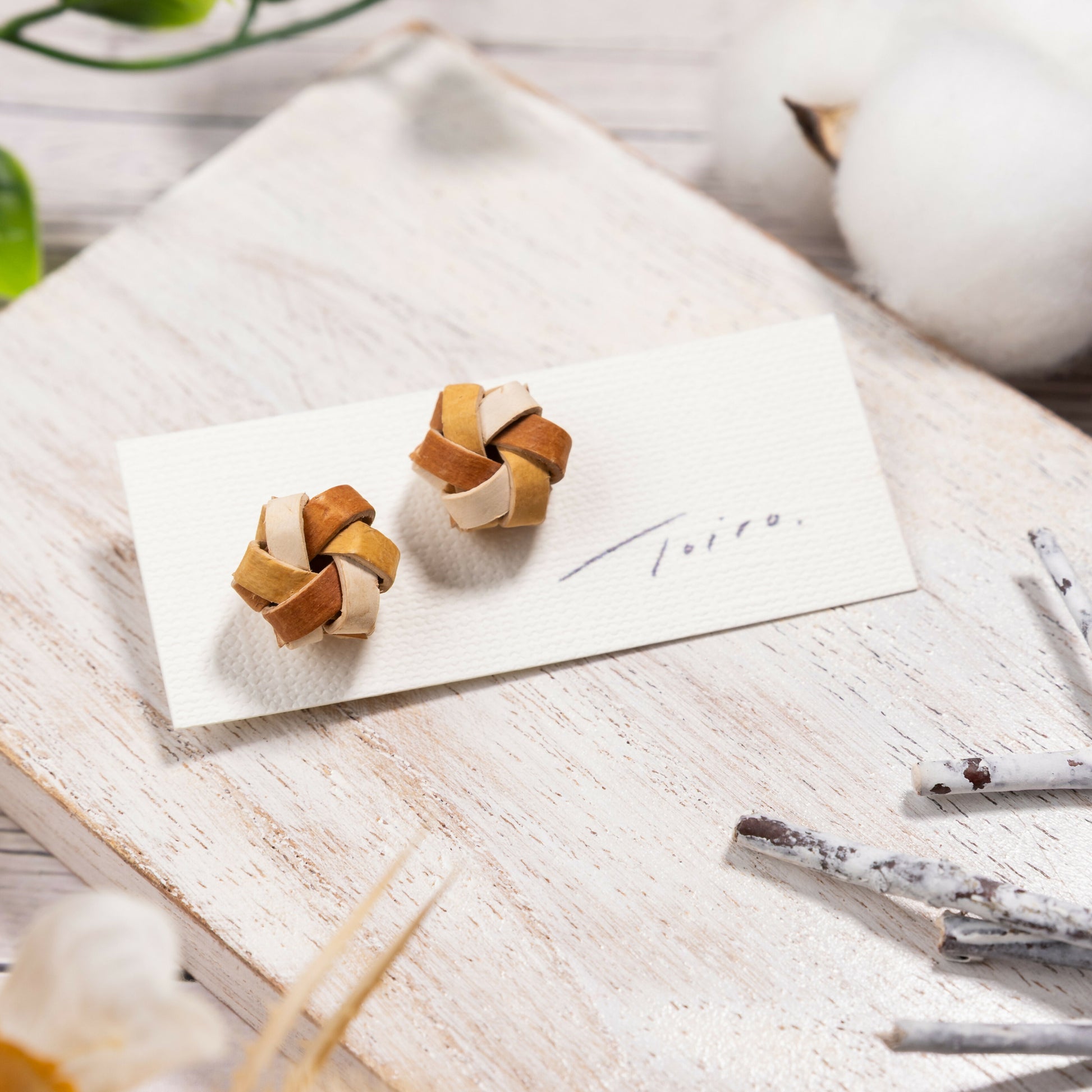 白樺の樹皮を結ぶように重ね、小さなかたちに仕立てたアクセサリーです。